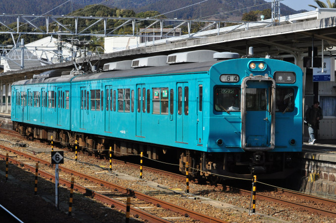 まずは新宮駅のホームに行ってみます。早速、スカイブルー1色に塗られた105系に出会います。違和感の多いJR西日本の単色化ですが、この色は103系でお馴染みであることもあり、珍しく違和感ありませんね。まあ、前面にブラックが入っているので、厳密には単色ではないのですが・・・。