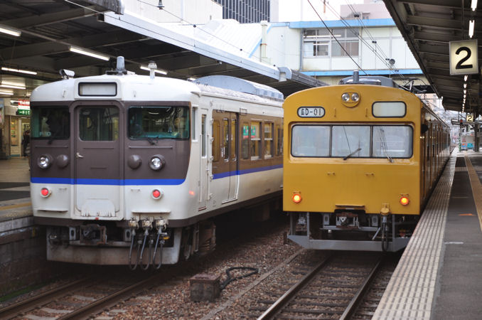 単色化された可部線の105系との並び。しかしまあ・・・必ずしも単色化自体が悪いとは言いませんけど、中国地方の電化区間を走る車両の全てが、この色になってしまうというのは、オイオイ・・・という感じ。