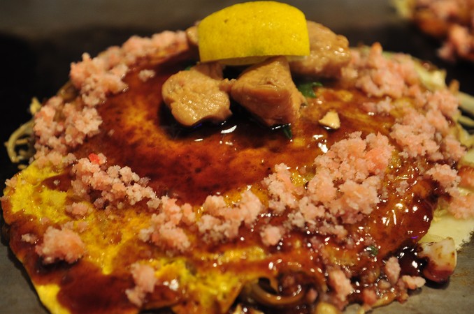 アニメでもお好み焼き屋として何度も登場しており、アニメにちなんだメニュー「真・ほぼろ焼」をいただきました。鶏の照り焼き、えびおぼろ、しょうゆ味じゃがいもなどが入っており、レモンを絞って食べるというもの。絶品でございました。 レモンと、お好み焼きソースもマッチしますね。食べ慣れた、お好み焼きソースにアクセントが入り、新鮮でした。