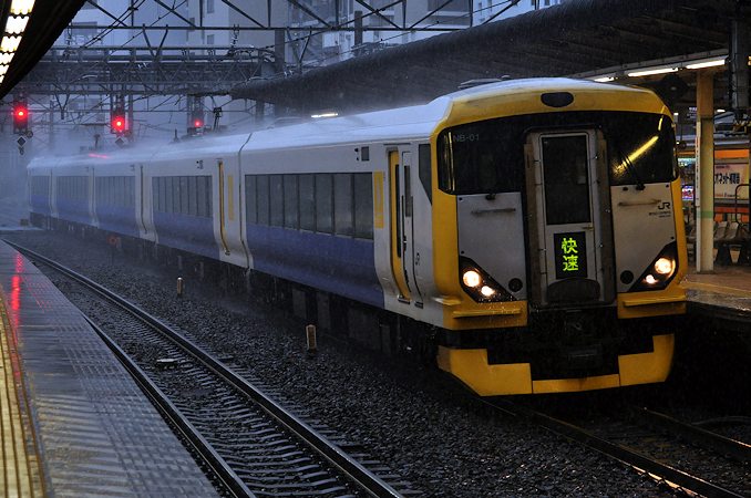 本日は秩父路号所員と味野源次さんと陸上自衛隊広報センターへ行くことに。その前に、中央線で少々撮り鉄をすることにしました・・・が、ご覧の通りの雨。 まずは国分寺駅で253系による特急「はちおうじ日光」を撮影します。LEDによる愛称表示で、きちんと「はちおうじ」の文字も入っています。