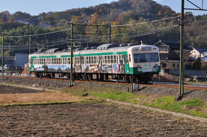 後追いだと順光。架線柱も邪魔にならず、素晴らしい状態です。ちなみに、こちらの編成はヨコオデイリーフーズによる「こんにゃく博物館」PRラッピングとなっています。ヨコオ食品工業時代の広告塗装と比べると、美しさが格段に違います。