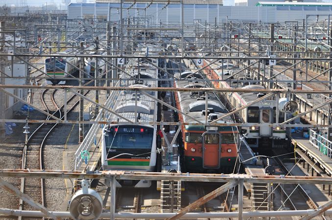 電車区の反対側に回ってみると、このような並びが。一昔前は珍しくもない光景だったもしれませんが、このご時世に湘南色の115系が3並びとは。