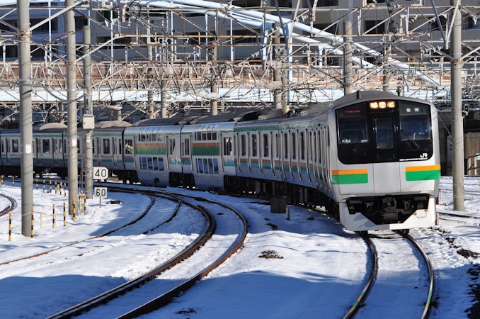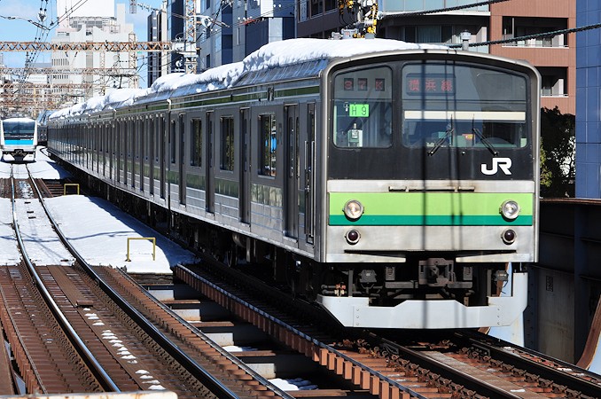 屋根の上に雪をビッシリと載せた205系が関内駅を発車して行きます。