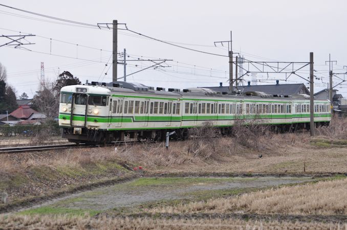 115系。新潟地区の115系は、様々な両数、色の組み合わせで運転されるのがユニークです。