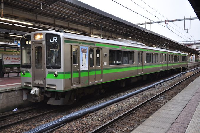 SLばんえつ物語キャラクター「オコジロウ」を側面にラッピングしたE127系。今後は大半の車両が、えちごトキめき鉄道に譲渡されるため、この界隈で、この塗装で見られるのも貴重になるかも・・・。