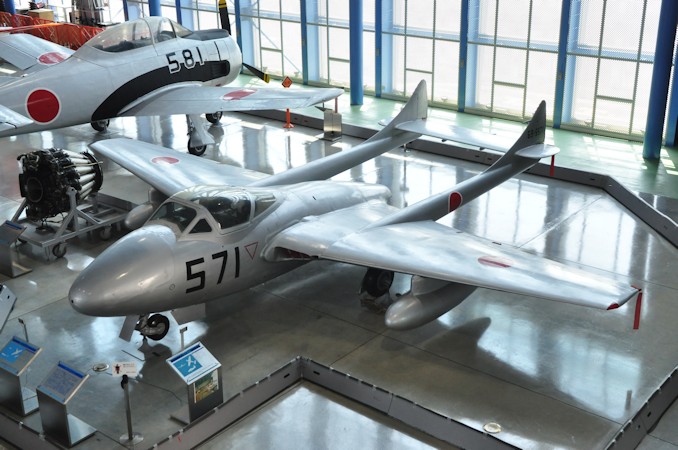 デ・ハビランド バンパイアT.55もいました。練習機の研究・調査用に1機のみ購入したそうで、その1機がここで展示されています。この浜松広報館の見どころの1つではないでしょうか。 他の機体については後日紹介いたします。 さて、我々はこの後に全周天シアターで迫力ある離陸、飛行の映像を楽しみながら、浜松市中心部へと戻ります。
