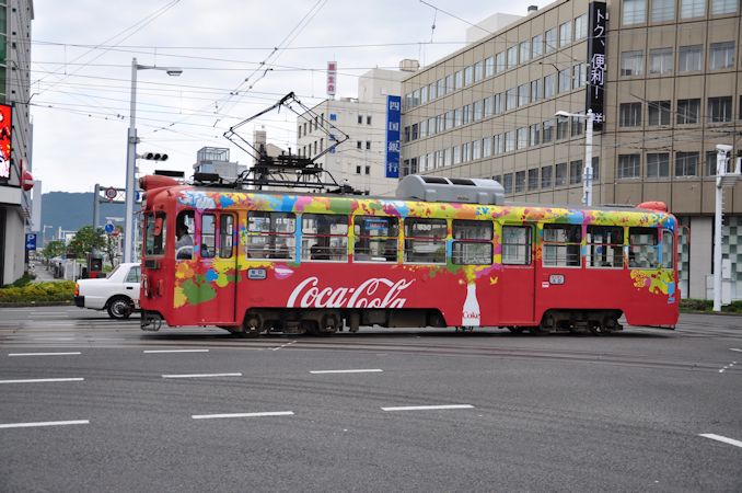 そして、はりまや橋へ移動。今度はコカ・コーラ広告電車を撮影。この日の朝はカラフルな列車と立て続けに出会います。