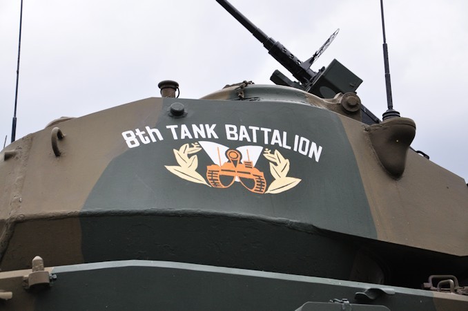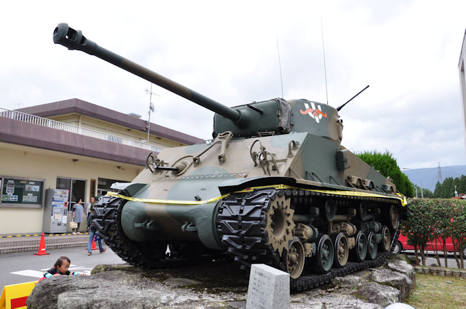 博多駅でkajibooh所員の車に乗り込んだ所長&馬藤所員は、大分県玖珠町にある陸上自衛隊玖珠駐屯地へ。この日は毎年恒例の一般公開(玖珠駐屯地開設記念行事)が行われ、通常であれば観閲行進などがあるため、「それはぜひ見たい!」と向かったのですが、台風接近に伴い、物販以外すべて中止とのこと。 やむを得ない事態ですが、それでも収穫がなかったわけではありません。 玖珠駐屯地には3両の戦車が保存されており、まず上写真はM4中戦車「シャーマン」。ここで見られるとは・・・!