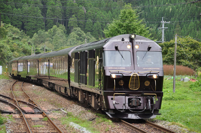 ななつ星はこの後、由布院駅で長時間停車しますので、駅の反対側から客車を狙ってみました。編成全ては入りませんが、線路がカーブしているので客車の側面もそこそこ入ります。