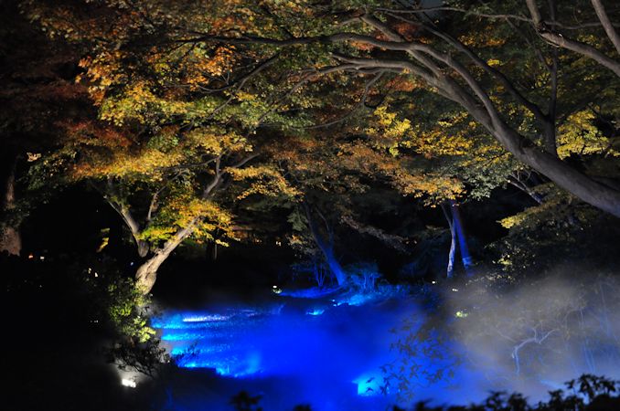 最大の見どころはこちらでしょうか。紅葉は若干色づきがまだでしたが、青く光りミストが出てくる演出は見事なものです。