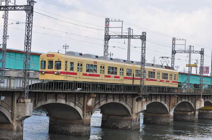 313形が貝塚駅で発車を待つ間、我々は名島橋へ移動。まずは橋を渡る600形を撮影します。