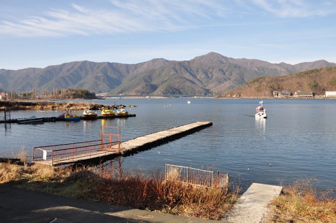 そして、一応徒歩で河口湖まで歩き、ゼニガタ所員に「これが河口湖だ」と紹介しています。まあ、琵琶湖を見ている方には恐縮ですし、景色としては今が一番中途半端な時期かも。
