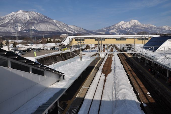 雪はかなり残っていますが、天気はよく山々の美しい姿もよく見えます。それでは、ここからリン所員と合流していよいよ信越本線三昧の3日間を本格開始することにしましょう。