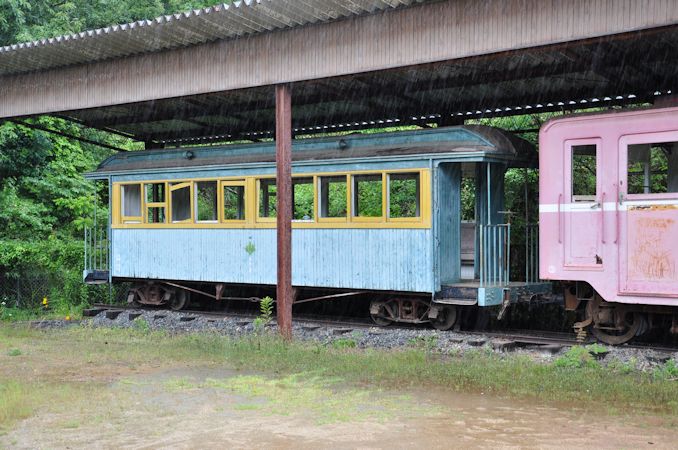 鉄道ネタに戻りまして、ご覧のように雨足が強まる中、井原市笹賀町 経ヶ丸グリーンパーク(子供の村)で保存されている、井笠鉄道ホジ101と、ホハ8を見に行きます。ちなみに井笠鉄道は、1971(昭和46)年まで運転されていた軽便鉄道です。