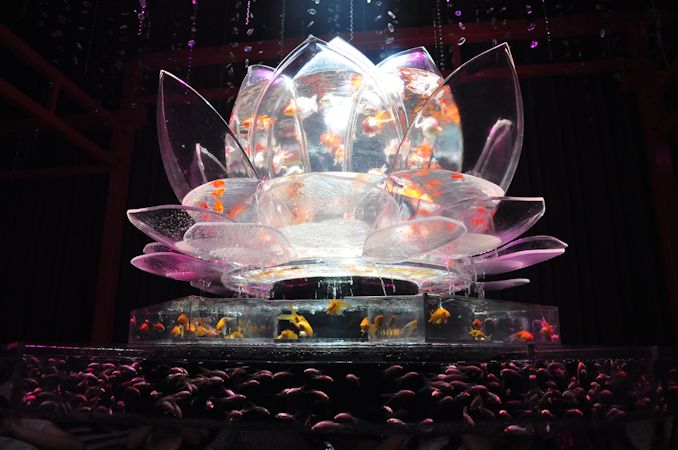 今年のプロジェクションマッピング。水槽の背景が金魚の動きにも連動しながら色々と変化します。