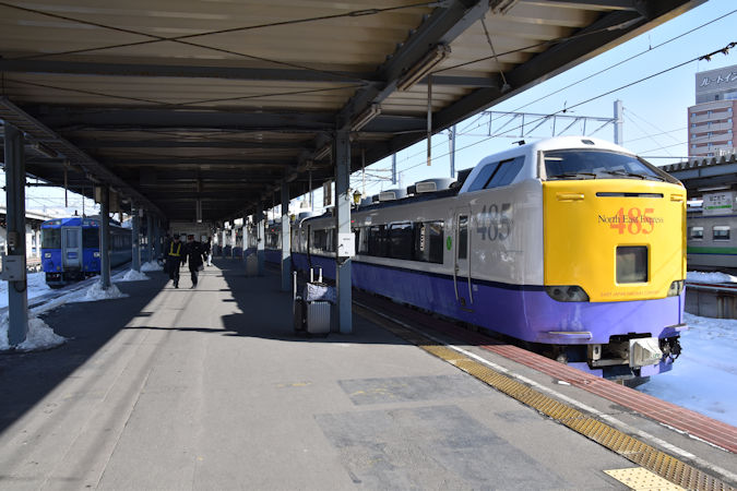 キハ183系特急「北斗」との並びを狙いますが、流石に485系の前で記念撮影をする観光客が続出しており、キハ183系が発車した際に、この程度の撮影となったのがせいぜいでした。