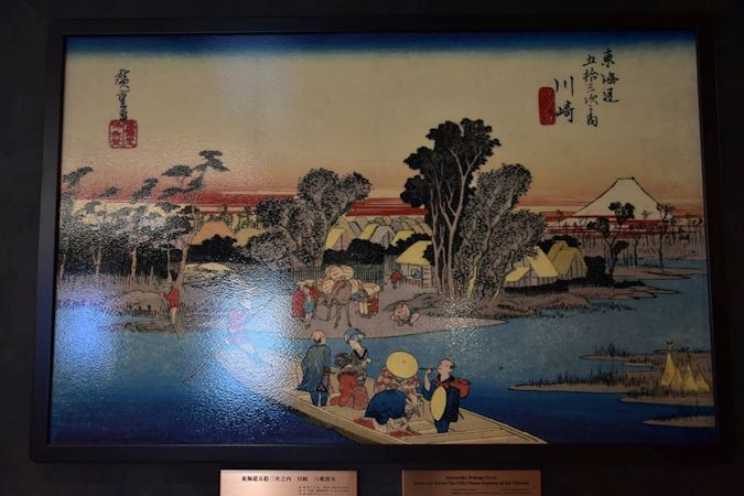 また、旧東海道川崎宿の絵が飾られています。今や高層ビルに囲まれていますが、絵を見る限りでは富士山が見えたようで・・・。