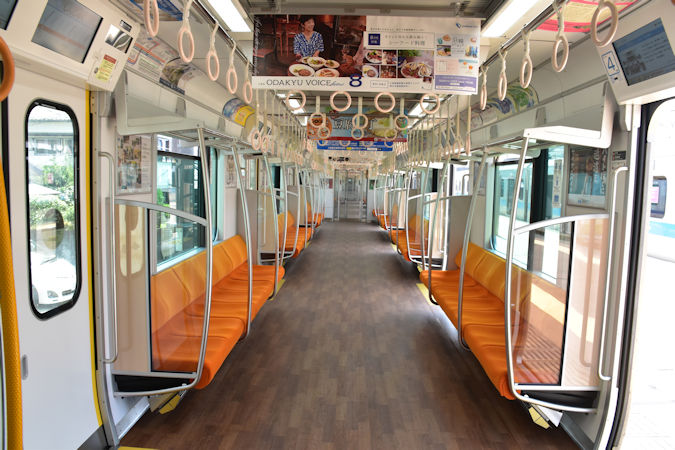 片瀬江ノ島駅まで追いかけ、車内の写真を撮影。床が木目調で、一般座席がオレンジ色なのが目を引きますね。