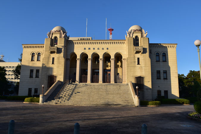 ここからは再び史跡巡り。こちらは豊橋市公会堂 【国登録有形文化財】。1931(昭和6)年築。中村與資平の設計で、鉄筋コンクリート造3階建て。豊橋市制25周年を記念したもので、玄関の半円アーチや3階の2連アーチ窓などロマネスク様式を基調としながら、スペイン風の円形ドームを載せているのが特徴です。