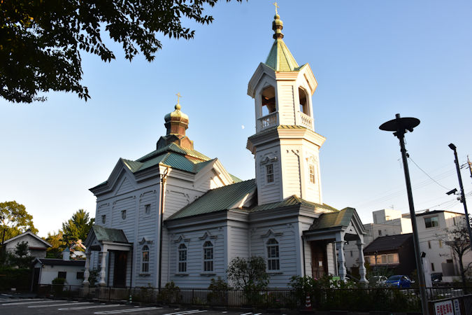 豊橋ハリストス正教会聖使徒福音者馬太聖堂 【国指定重要文化財】。1913(大正2)年築。ハリストス正教会の司祭建築家である河村伊蔵の設計で、玄関を西側に設け、東に向けて啓蒙所、聖所、至聖所を一直線に並べる、ハリストス正教会聖堂に共通する形式で建築。玄関の上には八角形の鐘塔を載せています。