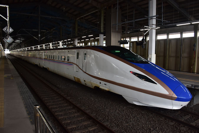 一旦新幹線ホームへ行くと、ピンク色のラインが入った上越新幹線オリジナルのE7系が停車していました。