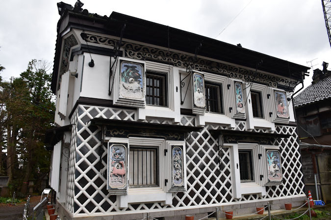 鏝絵の蔵は、左官職人・河上伊吉が手掛けたものですが、彼はなんと仁太郎に誘われて酒・味噌・醤油・薪炭の行商人から転身。修行の上で吉澤家の13の建物を手がけました。立体感あふれる鏝絵が大いに目を引きます。