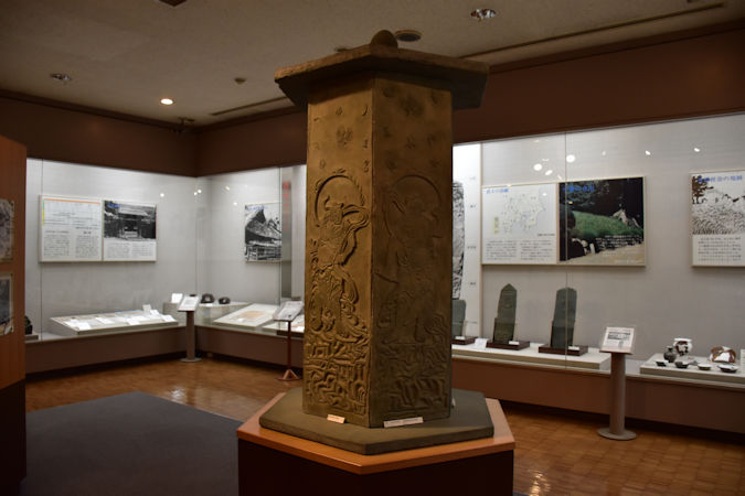 国宝である六面石幢(ろくめんせきとう)のレプリカが見どころの1つです。立川市柴崎町にある普済寺蔵で、1361(延文6)年に造られたもの。仁王像と四天王像を刻んだ6枚の緑泥片岩の板石を六角の柱状に組み合わせたもので、六角形の笠石が載せられています。
