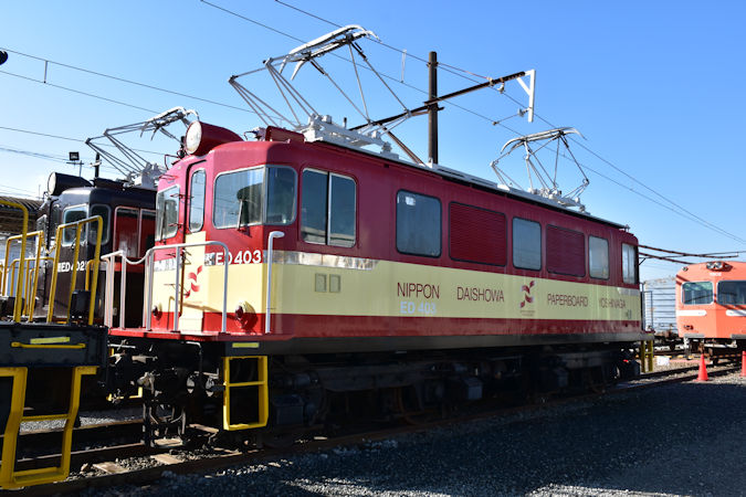 ED402(昭和40年製)。松本電鉄(現・アルピコ交通)で活躍していた日本車輛製の電気機関車で、ダム開発の資材運搬に従事していました。ダム工事完了後、1971(昭和46)年に岳南鉄道に2両が譲渡され、後に、3号機が赤色とクリーム色の日本大昭和板紙(現在は日本製紙の板紙事業部)のコーポレートカラーに塗られたのち、茶色とクリーム色に改められています。