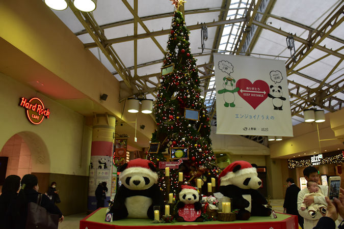 帰路に上野駅に行くと、巨大なクリスマスツリーとパンダ親子が出迎えてくれました。
