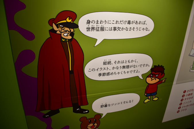 続いて、国立科学博物館で2022(令和4)年11月1日〜2023(令和5)年2月19日まで開催されていた、特別展「毒」を見ます。今回のテーマは、「動物、植物、菌類、そして鉱物や人工毒など、自然界のあらゆるところに存在する毒について、動物学、植物学、地学、人類学、理工学の各研究分野のスペシャリストが徹底的に掘り下げ、国立科学博物館ならではの視点で解説」とあり、毒をテーマにした展示は科博で初めてとのことですが、いきなり「秘密結社 鷹の爪」が登場したのは驚きました。