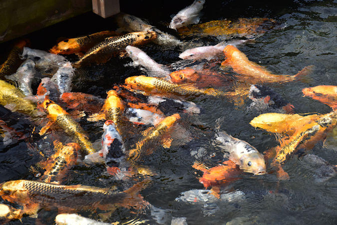 さすが新潟。フィーディングプールで、ニシキゴイに餌をあげることができます。