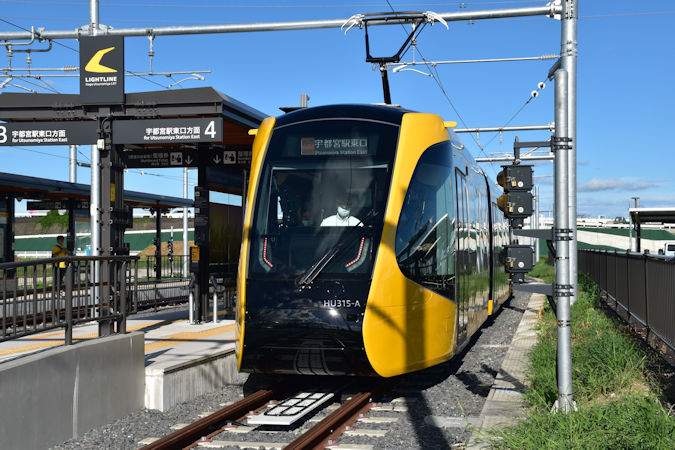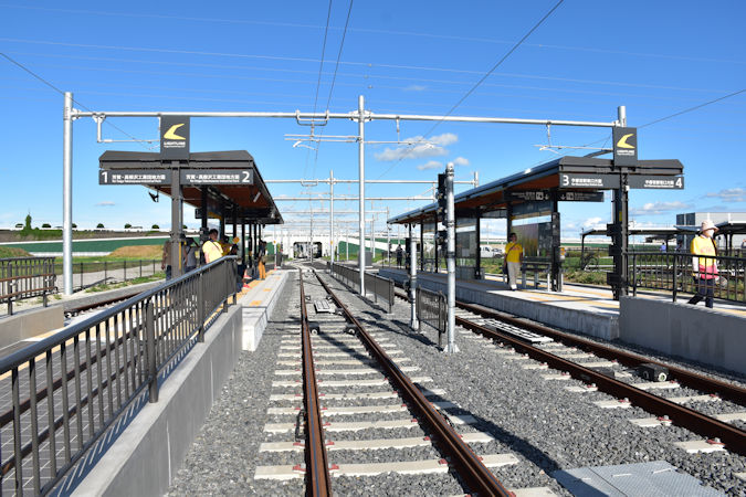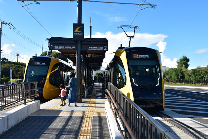グリーンスタジアム前。宇都宮ライトレールが絶妙なのは、沿道に大型商業施設、文教施設、スポーツ施設、工業団地などが絶えず配置されており、平日、土日ともに集客している点です。
