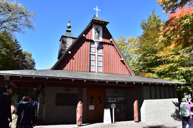 奥を抜けると、軽井沢聖パウロカトリック教会がありました。1935(昭和10)年築で、設計は日本近代建築の父といわれる米国の建築家アントニン・レーモンド。三角屋根を持つ木造の美しい教会です。