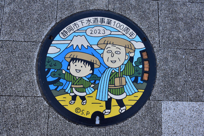 そして、こちらにも「ちびまる子ちゃん」マンホールがあります。デザインは、まる子と友蔵が旧東海道を歩いている様子で、歴史と伝統を継承する葵区のイメージを表現しています。