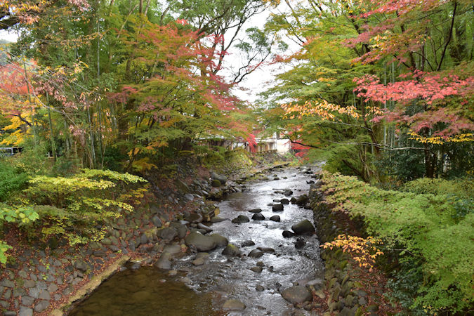 桂川を中心に温泉街が広がります。写真手前は、空海が開いたといわれる独鈷の湯(とっこのゆ)。807(大同2)年、修善寺を訪れた空海が、桂川で病気の父の身体を洗う少年の孝行の心に打たれて、持っていた仏具(独鈷杵)で川の岩を打ち霊泉湧き出させ、父親の病気はたちまち癒えたとか。