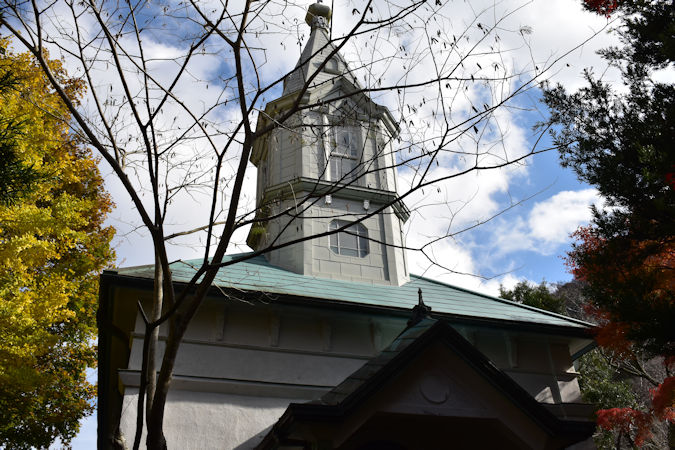 1912(明治45)年に建築されたハリストス正教会。神田駿河台(東京)の通称「ニコライ堂」で知られる、ニコライ大主教が病気治療で修善寺に湯治に来たときに、ニコライの病気平癒を祈願し、70名の信徒と職人によって3ヶ月半で完成したといわれます。18mの鐘楼が目を引くほか、内部は通常非公開ですが、旅順にあった聖堂から移設された聖堂内のイコノスタスが特徴です。