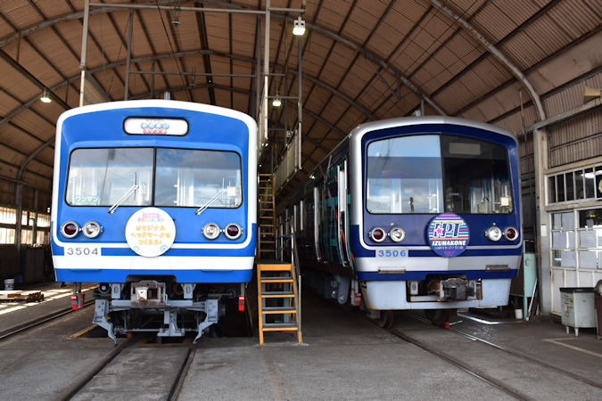 今度は沼津駅へ向かおうとしたところ、駿豆線ホームに3000形(3001編成)による軌道線復刻風塗装が入線してきました。まるで江ノ電?