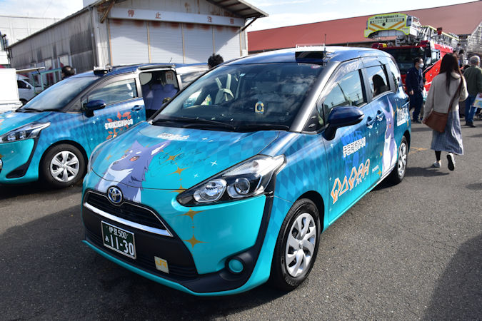 ちょうどよい時間にバスが無かったため、徒歩で修善寺駅に戻るとラブライブ!サンシャイン!!仕様の伊豆箱根タクシーが展示されていました。伊豆箱根鉄道で開催された「いずはこねふれあいフェスタ2023」の一環です。