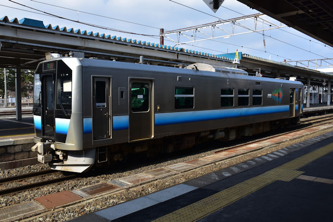 続いて盛岡駅へ。IGRいわて銀河鉄道ホームへ行き、2022(令和4)年2月17日に登場した「漆」&「縄文」 県北ラッピング列車を撮影。二戸地域への観光客等の誘客促進、IGRの利用促進等を目的に、二戸市の「漆掻き技術」と一戸町の「御所野遺跡」の、世界が認める2つの文化遺産をイメージし、車両をラッピングしたもの。柱が邪魔で微妙な写真に。