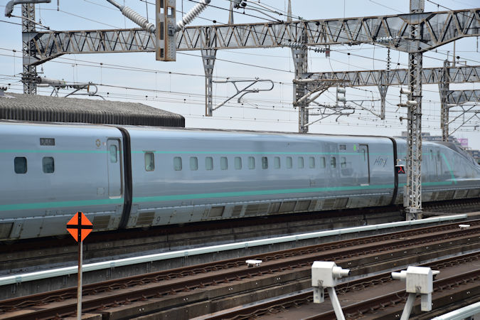 停車中に編成写真を撮影。新青森方の10号車のノーズ部分は約22メートルという異様な姿です。さて、改めて1両ずつ…と思っていたら、直ぐに折り返して発車していきました。