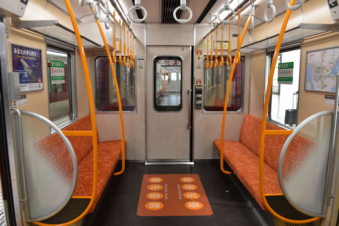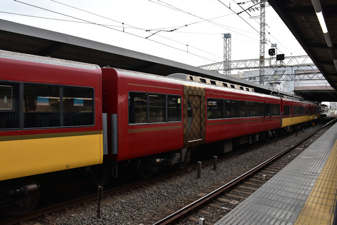 京都駅では、近鉄1233系(1237編成)のリニューアル編成を撮影。近鉄で2023年夏から進められている大規模リニューアル工事で内外装が一新され、シートモケットの色・柄や袖仕切り形状が大きく変更されたほか、大型ディスプレイによる車内案内表示器を扉上に千鳥状に配置し、さらに室内照明はLEDからの間接照明になっています。