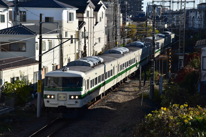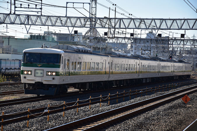 午後は当初の予定通り常磐線沿線で185系C1編成を追いかけます。まずは、金町駅で新金貨物線へ入る前の姿を撮影。この日は、団体臨時列車「洗浄機体験付、操車場巡りの旅」として運転され、上野→大宮→東大宮操車場→大宮操車場→田端操車場→金町→新小岩操車場→金町→上野を走行しています。