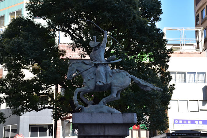 日暮里駅前の太田道灌騎馬像。太田道灌は、戦国時代に関東管領上杉氏の一族である扇谷上杉家に仕えた武将で、江戸城を築城した人物として知られます。こちらの銅像は、僧侶で彫刻家でもあった橋本活道氏の作品です。