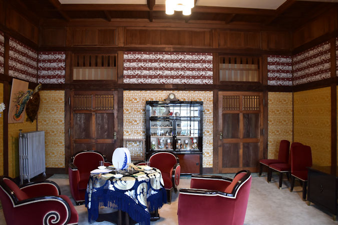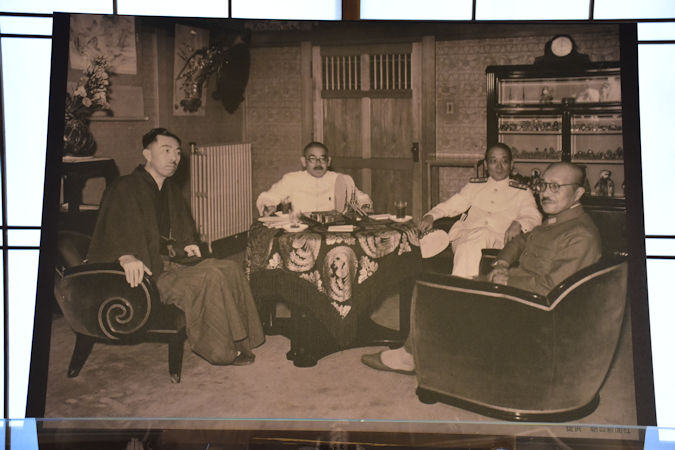 荻窪会談の舞台となった客間。今回の復元にあたり再移築された部分の1つで、写真2枚目は第2次近衛内閣発足を前にした、荻窪会談の際に撮影された写真。左から近衛文麿(次期総理)、松岡洋右(次期外相)、吉田善吾(海相)、東條英機(次期陸相)。この会談の後、日本は独伊と同盟を結び、南進政策を決めました。このほか、1941(昭和16)年10月に対米開戦を回避するための『荻外荘会談』なども開かれています。