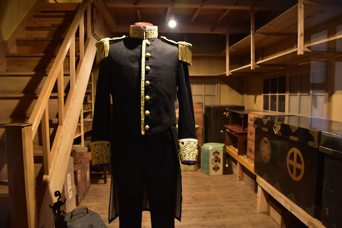 近衛文麿着用の有爵者大礼服(複製)。公爵であった近衛文麿は、襟と袖が紫色の大礼服でした。