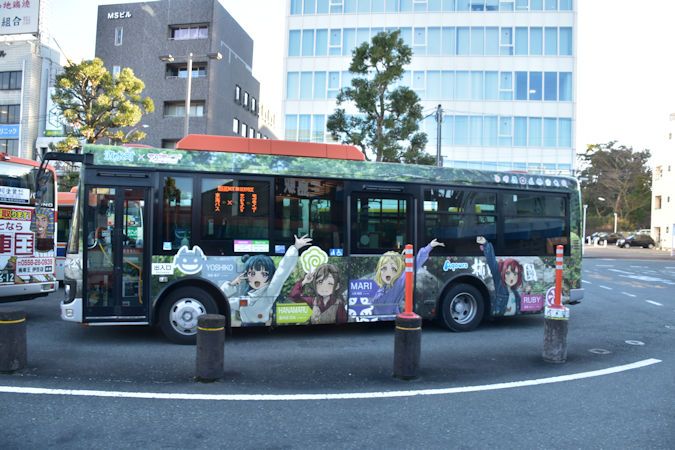 三島駅前に出ると、東海バスのラブライブ!サンシャイン!!ラッピングバス7号車「Guilty Kiss」がいました。