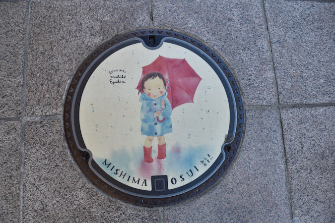 さて、三島市内中心部には新作マンホールが多数登場していました。2022(令和4)年に三島市中央町の「えほんやさん」前へ設置されたもので、三島市在住の絵本作家・えがしらみちこさんデザインのマンホール。『あめふりさんぽ』の絵本に登場するキャラクターが描かれています。