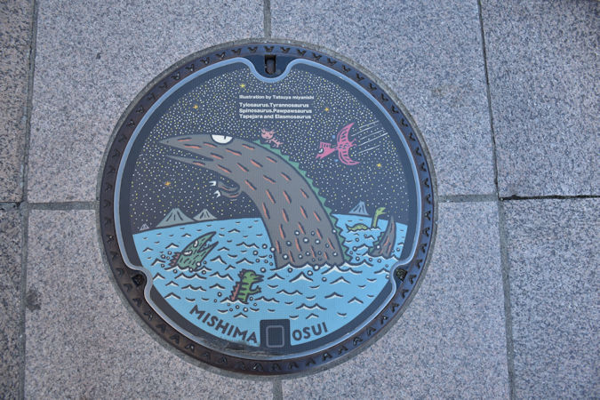 2022(令和4)年に三島市中央町に設置された、三島市在住の絵本作家・宮西達也さんデザインのマンホール。同氏の作品である「ティラノサウルスシリーズ」の恐竜が描かれています。