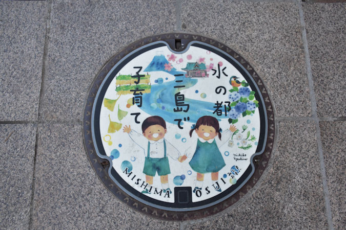 2022(令和4)年に三島市中央町に設置された、三島市在住の絵本作家・えがしらみちこさんデザインのマンホール。三島市が実施しているプロモーション「水の都三島で子育て」のシンボルデザインで、手をつないだ男の子と女の子を中心に、富士山、三嶋大社なども描かれています。
