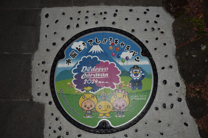 2022(令和4)年に楽寿園前に設置された、北海道テレビ(HTB)の人気バラエティー番組「水曜どうでしょうキャラバン2024 in三島」の開催記念マンホール蓋。北海道テレビのマスコットキャラクター「onちゃん」、三島市マスコットキャラクター「みしまるくん・みしまるこちゃん」、伊豆箱根鉄道のキャラクター「ライオンになりたいネコ」(通称ライネコ)が描かれています。